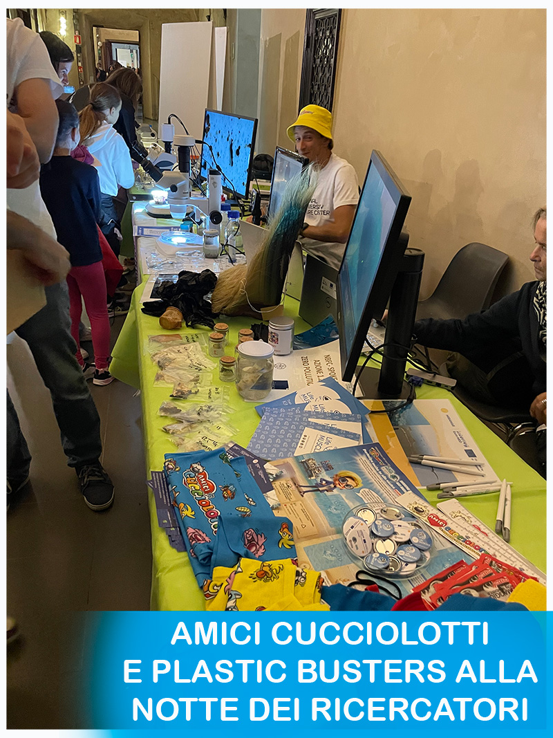 NOTTE DEI RICERCATORI (24 SETTEMBRE 2021) COME TUTTI GLI ANNI, L’ULTIMO VENERDÌ DI SETTEMBRE SI È SVOLTA LA NOTTE EUROPEA DELLE RICERCATRICI E DEI RICERCATORI. L’EVENTO, CHE A SIENA VEDE COINVOLTA L’UNIVERSITÀ DI SIENA E PRENDE IL NOME DI BRIGHT, HA VISTO COINVOLTI ANCHE I PLASTIC BUSTERS CHE HANNO SPIEGATO AI BAMBINI COSA FANNO GLI SCIENZIATI DENTRO AI LABORATORI E QUANDO SI RECANO IN MARE PER SALVAGUARDARE L’AMBIENTE MARINO E TUTTE LE SPECIE DI ANIMALI CHE LO ABITANO. QUEST’ANNO I PLASTIC BUSTERS, ANCHE CON IL COINVOLGIMENTO DI AMICI CUCCIOLOTTI, HANNO SVILUPPATO UN GIOCO PER FAR COMPRENDERE AI BAMBINI COME VENGONO INGERITI I RIFIUTI GALLEGGIANTI DAGLI ANIMALI MARINI, QUALI SIANO PIÙ PERICOLOSI PER LORO E QUALI CONSEGUENZE PROVOCANO SUGLI ANIMALI E SULL’AMBIENTE I COMPORTAMENTI SBAGLIATI DELL’UOMO. ATTIVITÀ IN LABORATORIO LA FANTASTICA SQUADRA DEI PLASTIC BUSTERS, GRAZIE AL SUPPORTO DI AMICI CUCCIOLOTTI, HA PORTATO AVANTI ANCHE LE ATTIVITÀ IN LABORATORIO ANALIZZANDO LE MICROPLASTICHE E LE SOSTANZE TOSSICHE INGERITE DA MOLTI DEGLI ANIMALI MARINI CHE ABITANO IL NOSTRO MAR MEDITERRANEO (MEDUSE E MOLLUSCHI, MOLTE SPECIE DI PESCI, TARTARUGHE MARINE, UCCELLI MARINI E CETACEI.) IL SOGNO CUCCIOLOGICO DI DIVENTARE UN PLASTIC BUSTERS NELL’ALBUM “AMICI CUCCIOLOTTI” TROVIAMO UN FUMETTO IN CUI VIENE RACCONTATA LA STORIA DI UN BAMBINO CHE DA GRANDE ENTRA A FAR PARTE DEI PLASTIC BUSTERS. UN RINGRAZIAMENTO SPECIALE VA A CRISTINA PANTI CHE HA IDEATO IL SOGGETTO DEL FUMETTO.
